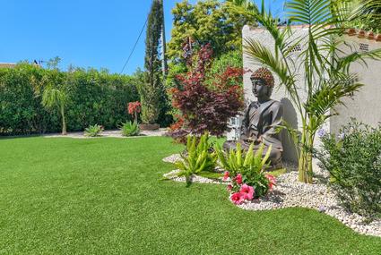 - smuk græsplæne med grus, træer og havemøbler med solstole