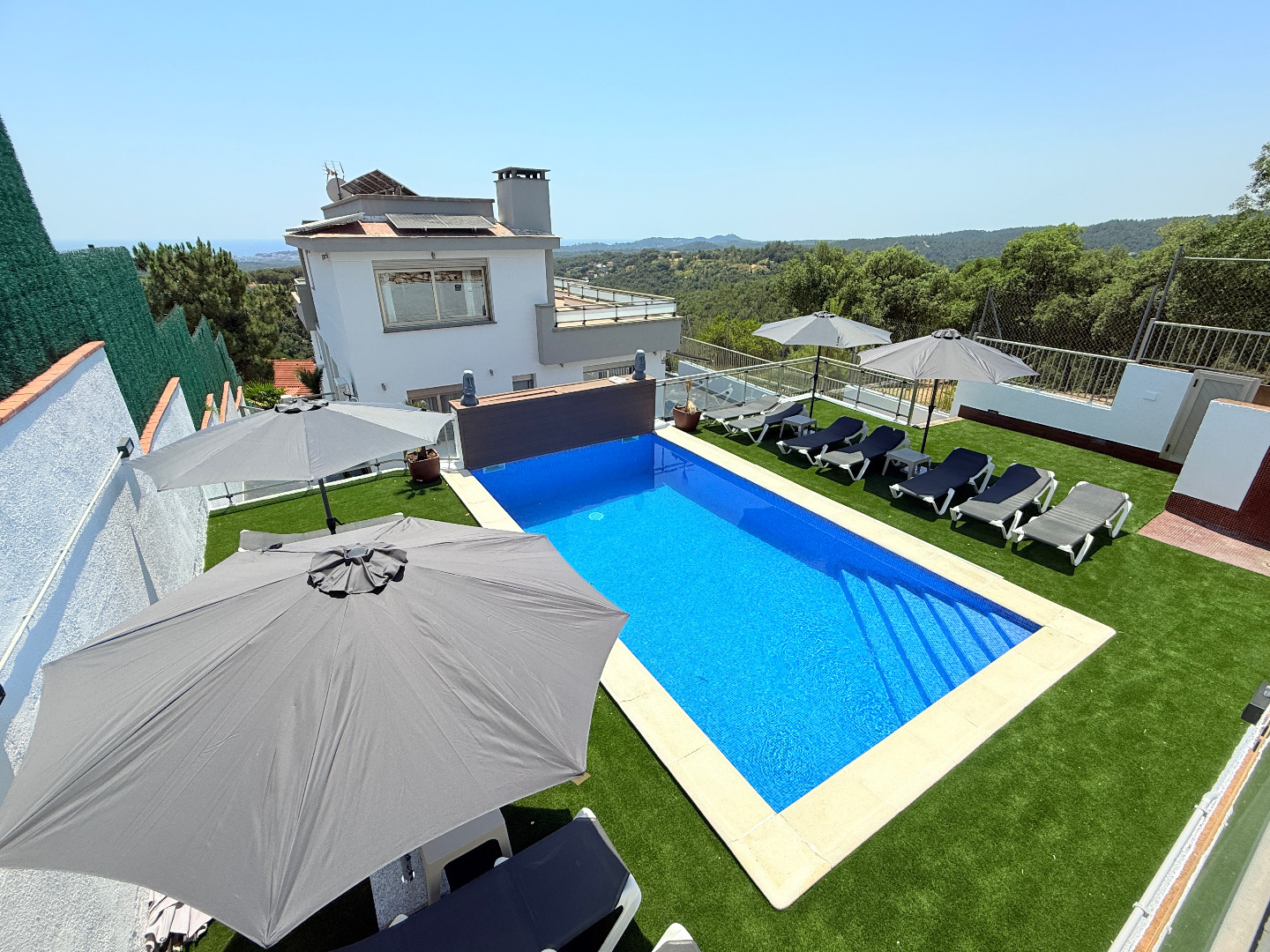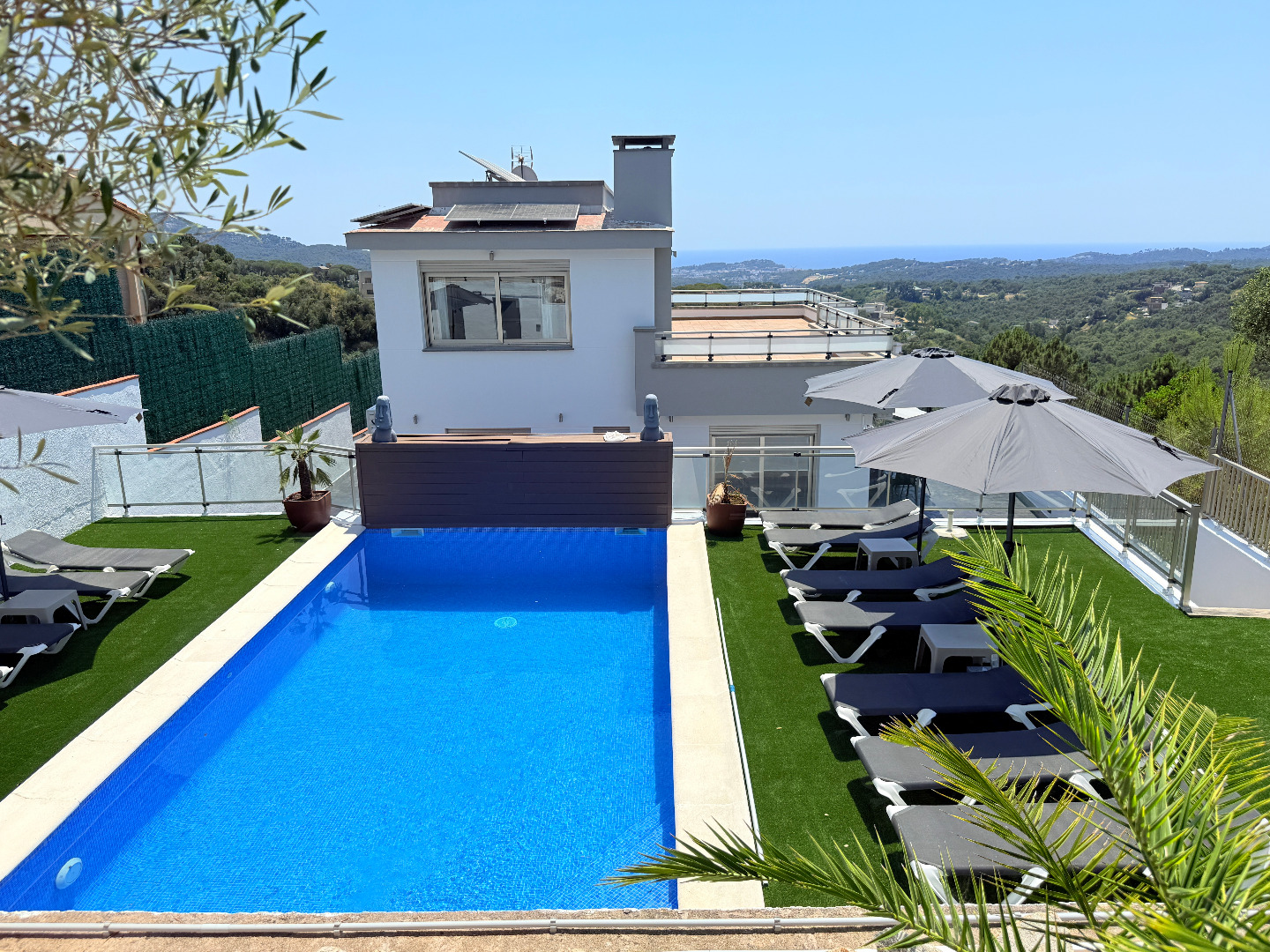 Searching for the ultimate holiday destination, where you and a large group can enjoy the Spanish sun? Then check out this beautiful detached villa! Together with other families or with your circle of friends you will have the time of your life here. This spacious and luxurious villa is located in a quiet villa neighbourhood and has 6 bedrooms, 5 bathrooms, a large kitchen and also a great private pool which is entirely secure and lockable, perfect and safe for families with small children. Around the swimming pool are fantastic lounge chairs, in which you can fully relax and enjoy the beautiful view of the surroundings and the Mediterranean Sea. The living and dining room has enough room for everyone to chill and relax. You can be sure everyone will enjoy it, thanks to the space and privacy you have here in the villa. For cooler nights, the fireplace provides an excellent solution. The kitchen is provided with all modern comforts. Together you prepare a great breakfast here, which you can then serve on one of the lovely terraces or the balcony. And very useful, that free Wi-Fi! You can take the most beautiful photos and instantly share them with all your friends. And look, there is even a stone barbecue. That one will be used a lot during this holiday. Because ask for yourself, what's better than enjoying a good meal in the outside air together during the evenings. And when everyone has gathered around the large outdoors table, the stories emerge. How was your day? What are we doing tomorrow? Are you going to the beach or shopping and then out for dinner at one of the nice restaurants? Whatever it may be, the villa is in a central location; the beach, shops, the restaurants and the night life are 5 km away from your villa. And when you return, there is enough room for 2 cars in the garage. You are more than satisfied when you see all these happy faces. You can enjoy it together; raise your glass to the good life and the Spanish sun! Reserve this villa and experience a wonderful time together in the hospitable Spain! Registration number: HUTG-003894